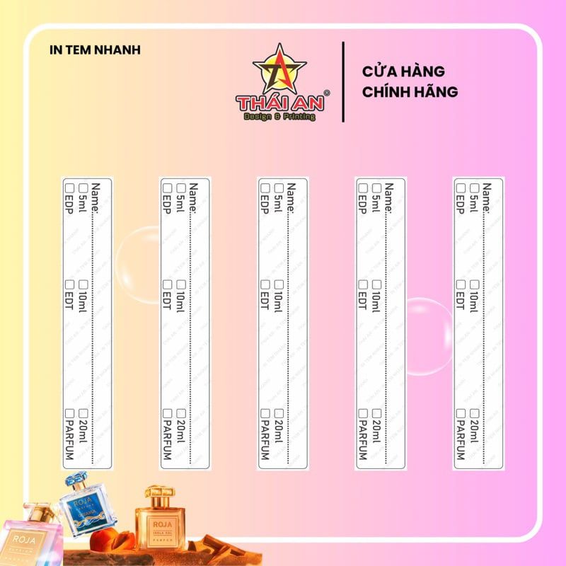 Công dụng: Tem dán chai nước hoa chiết vuông cao 10ml, khách tự ghi tên lên tem theo mong muốn