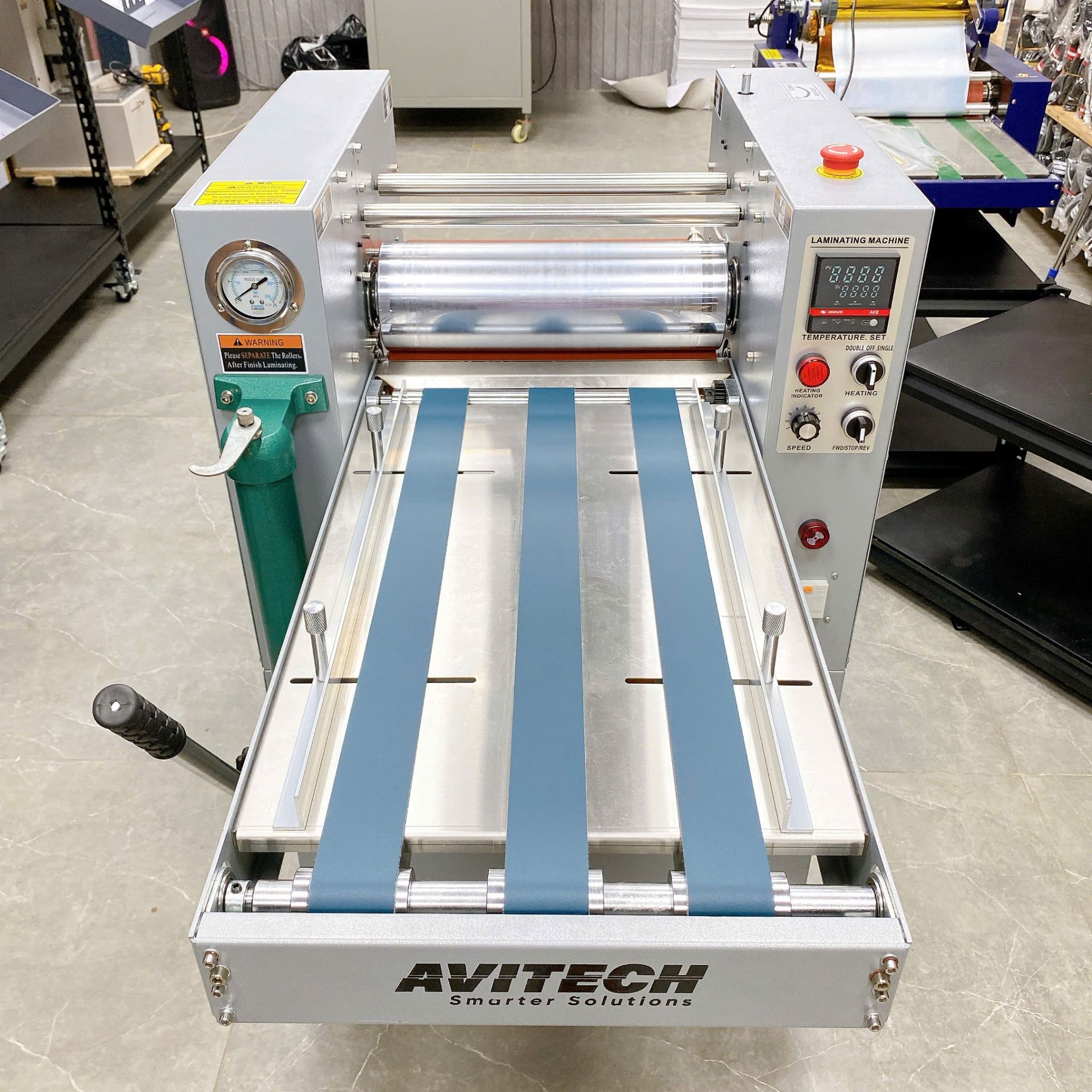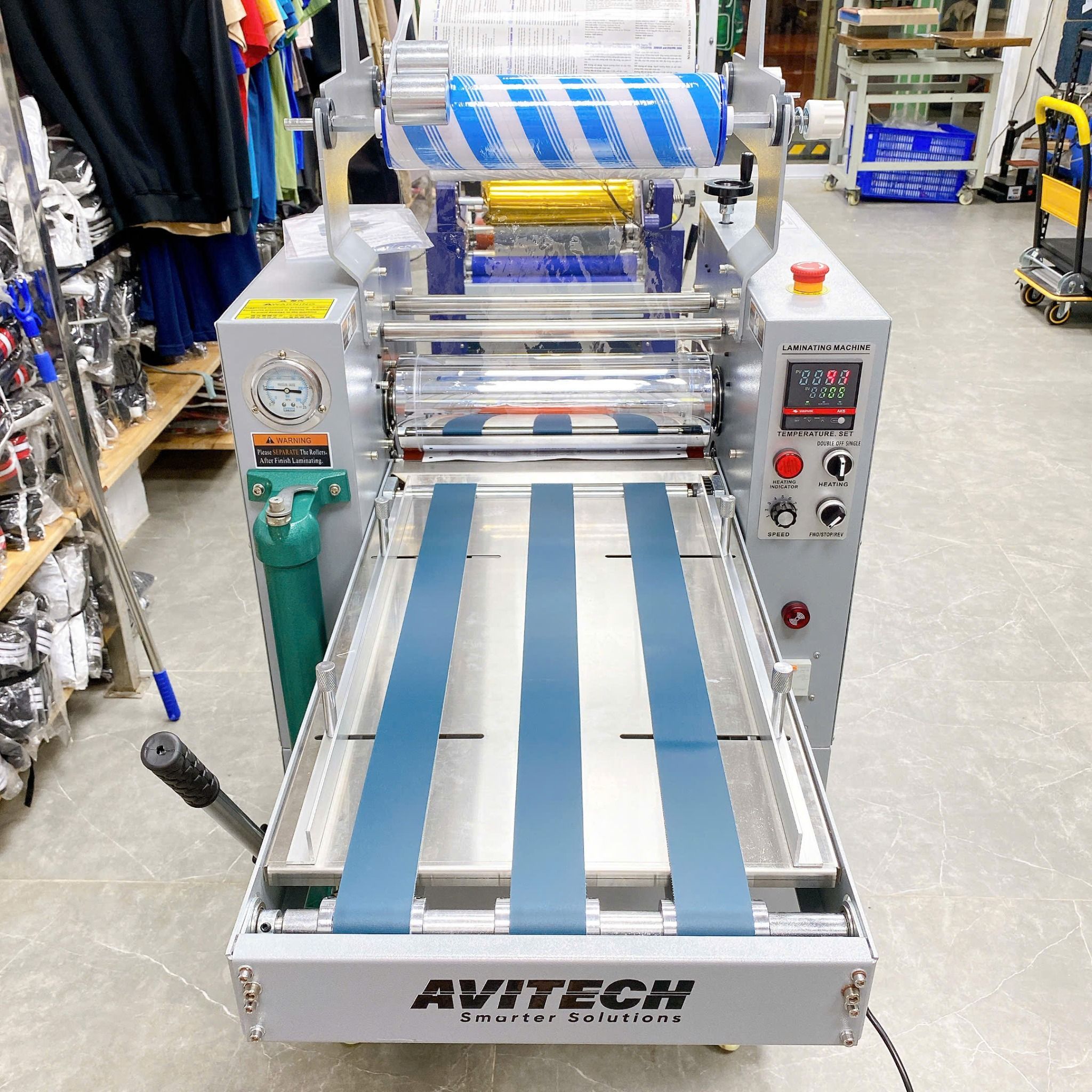 Áp lực cán khỏe thông qua hệ thống bơm dầu thủy lực, giúp cho thành phẩm cán chặt chẽ, sắc nét. Điều này được thể hiện càng rõ rệt hơn khi cán màng các sản phẩm có màu bệt như màu đen, màu xanh, đỏ,… Sản phẩm đẹp – sắc – nét.