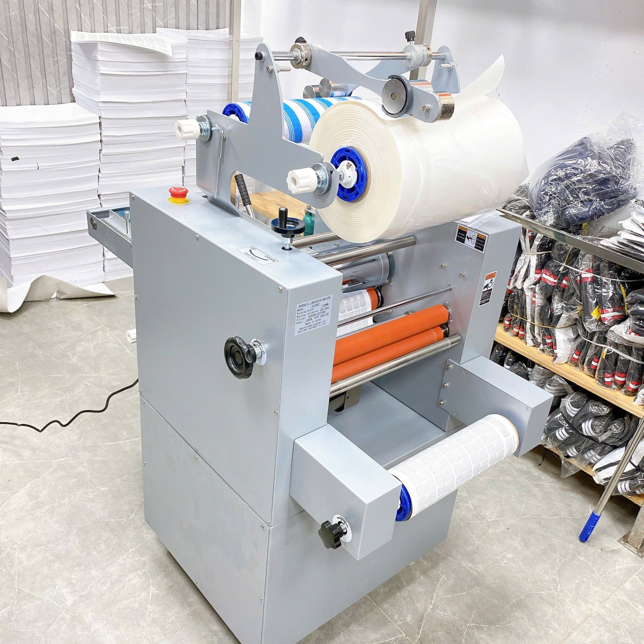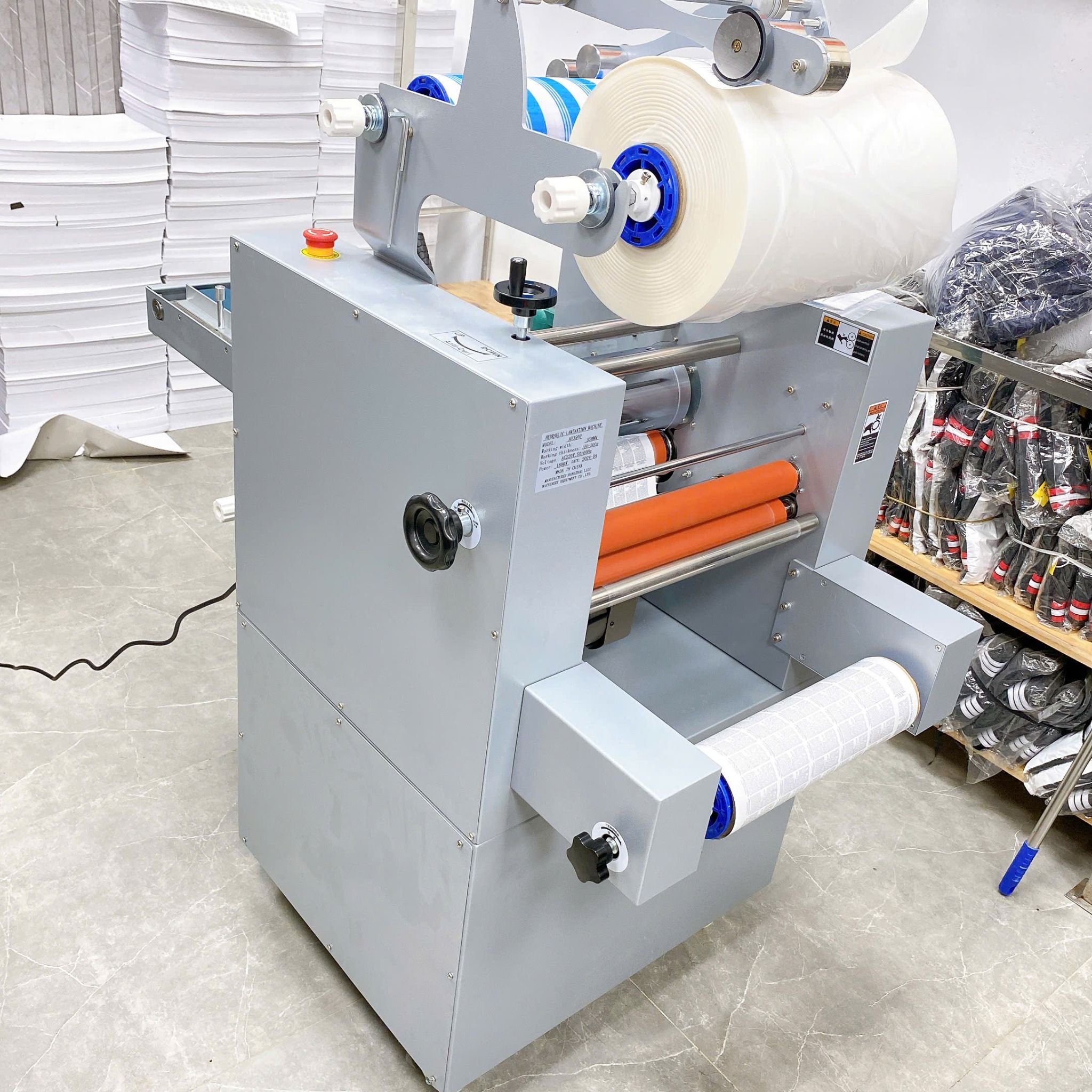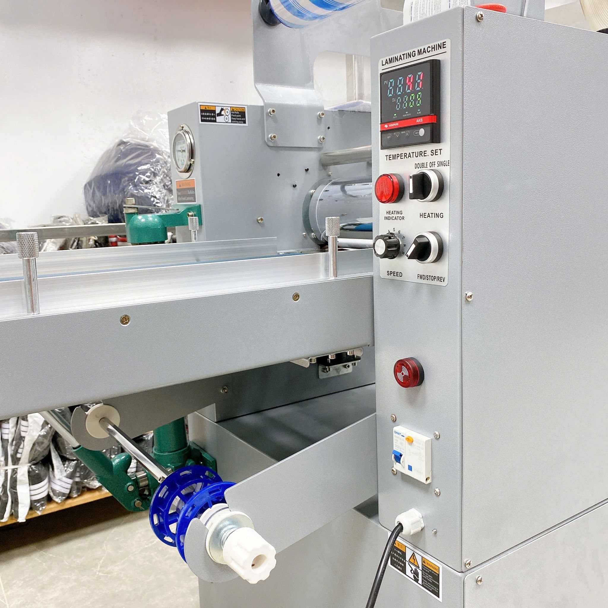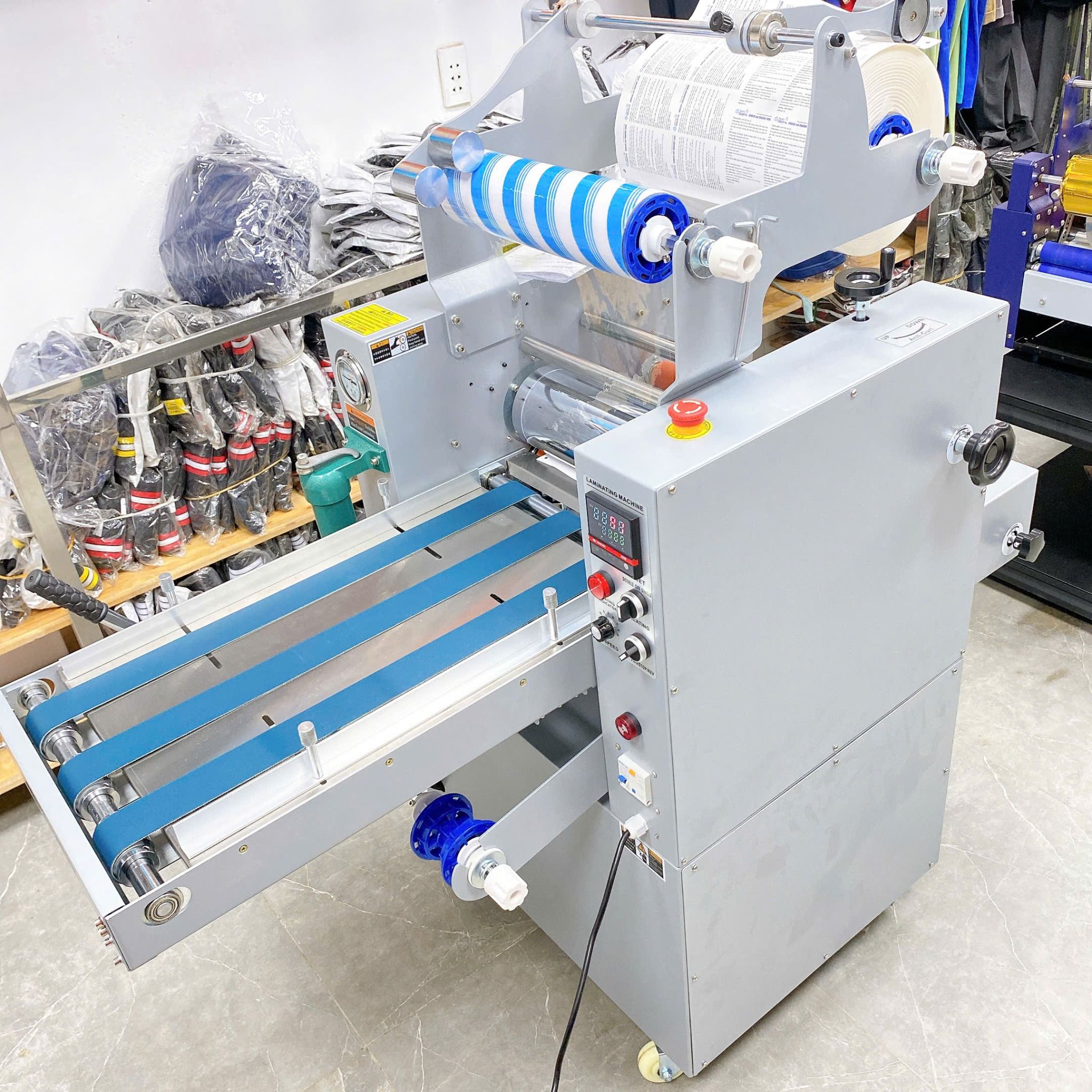 Máy sử dụng băng tải cấp giấy giúp giấy vào lô cán đều, ổn định và nhanh hơn, người chưa biết chạy máy cũng có thể sử dụng được.